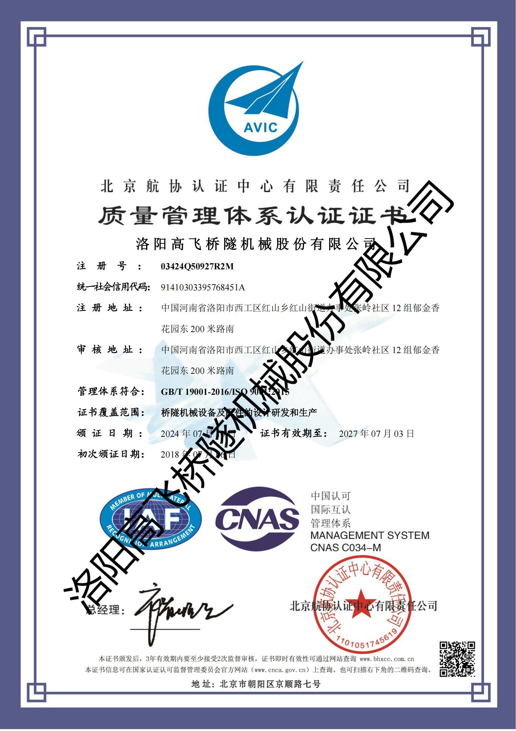 北京航协质量管理体系认证证书