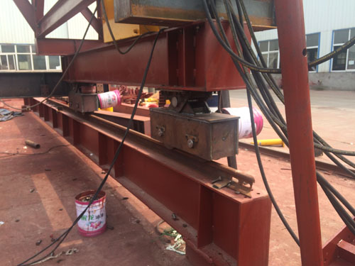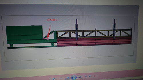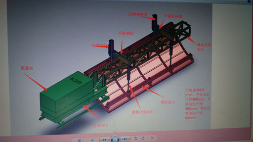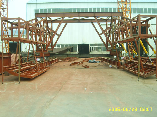 结构∶液压驱动自行式移动栈桥,主要由前桥、主桥、后桥、前段支架、后段支架、行走驱动装置、行走支架七个部分组成。