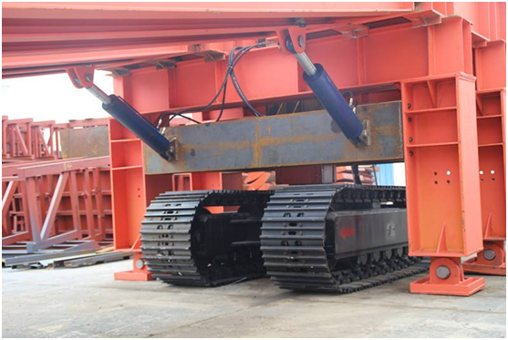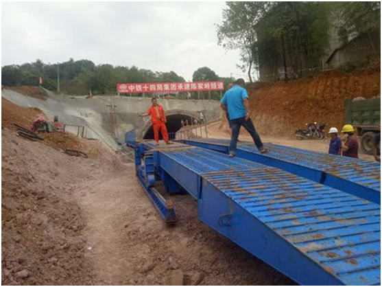 栈桥平移时,收起栈桥行走支架,将栈桥前后两端支架支撑在地面上,放下行走支架,使前端支架脱离地面,控制前后端支架中的平移油缸,使栈桥桥身整体左右平移,把前后栈桥放置在地面上,运输车辆即可在栈桥上通行,在栈桥下方进行仰拱的施工。由于主桥的跨度大可以同时进行仰拱的开挖和仰拱回填施工,出渣等。栈桥前进时,放下行走支架和后段行走驱动装置,使前后端支架脱离地面,开动行走驱动马达,使栈桥整体向前方移动到预定位置,行走驱动装置采用橡胶轮胎行走,无需铺设钢轨,可适用于各种开挖方式和不同工况,并且可以随时自由转换,操作简单、灵活,使用面极其广泛。