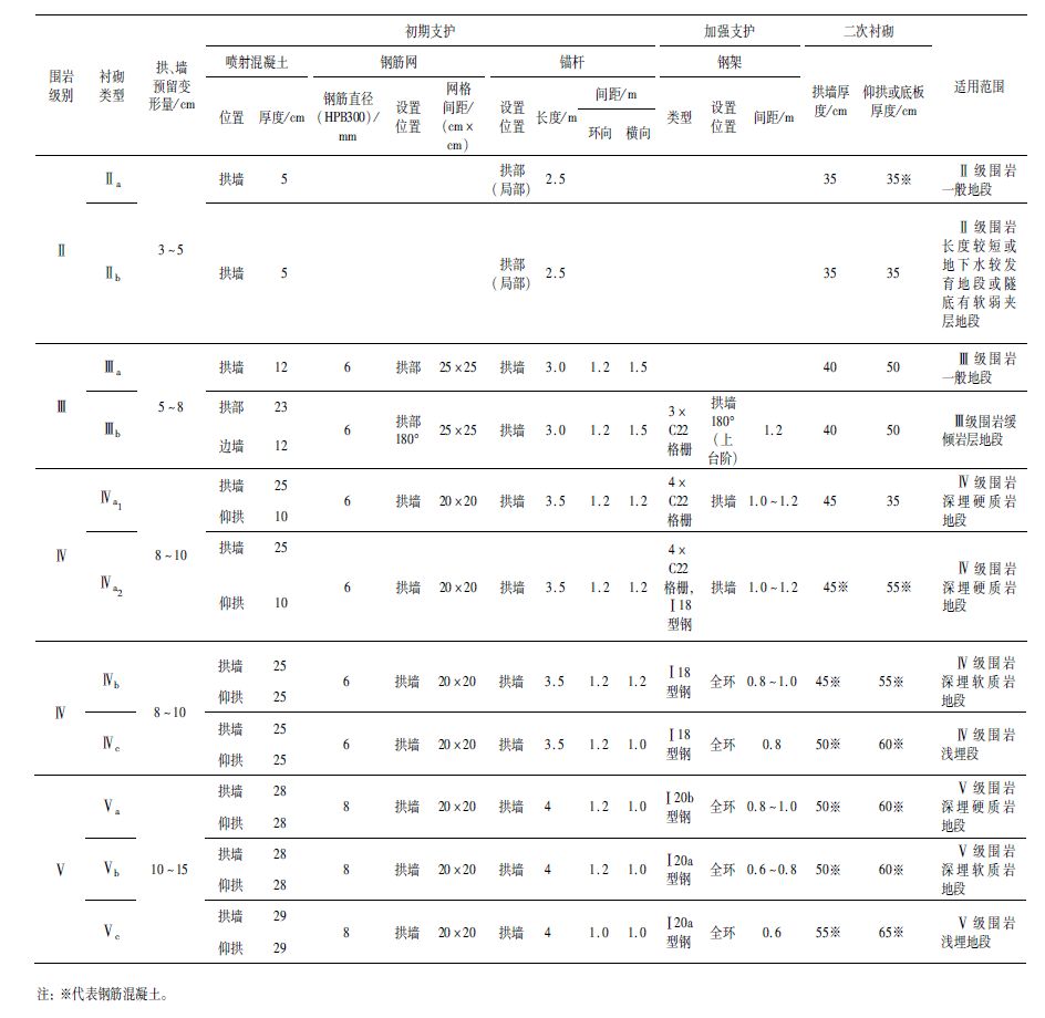 基于新奥法理念,隧道支护结构设计中将围岩和初期支护作为承载主体,承担部围岩荷载,二次衬砌作为安储备。
