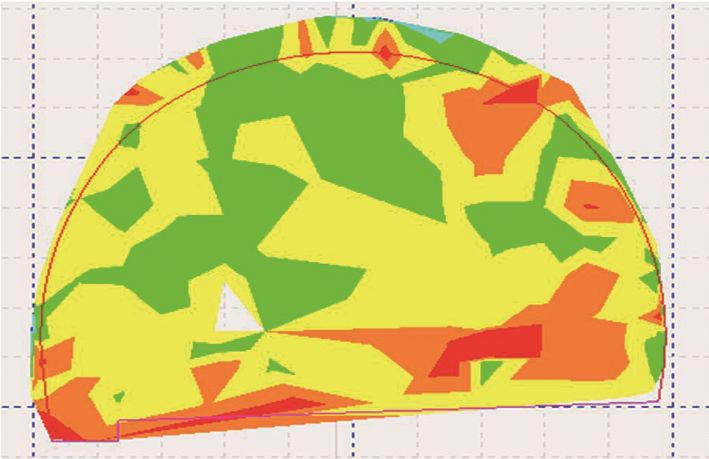 其中,超前钻孔及加深炮孔法主要利用电脑三臂凿岩台车进行超前地质预报,进行钻孔作业时,实时监测推进速度、冲击压力、推进压力、回转压力、水压力和水流量等参数,并通过MWD软件分析复原地质情况(MWD地质云图如图7所示),形成地质报告,由此可建立隧道大数据地质库。